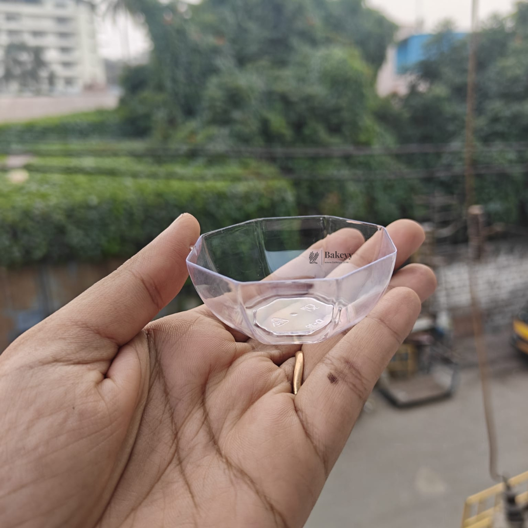 Its transparent finish makes it ideal for colorful sauces like ketchup, mustard, green chutney, soy sauce, cheese dips, and dessert toppings. The faceted octagon design adds a premium touch compared to regular round bowls.