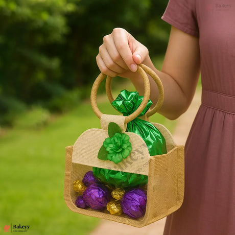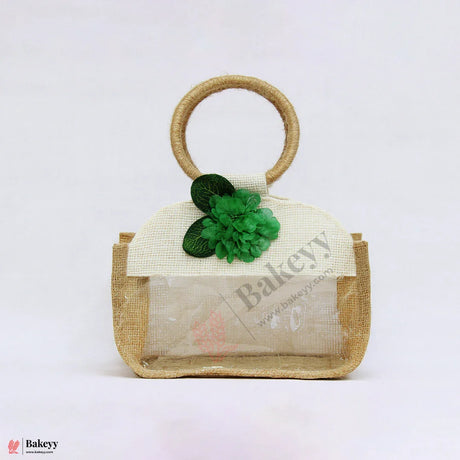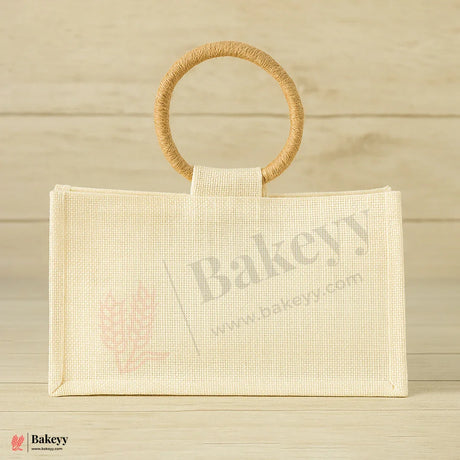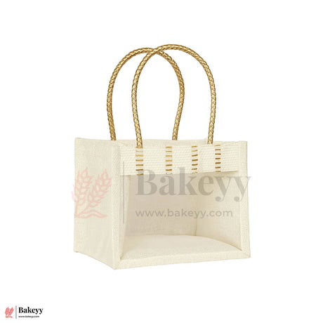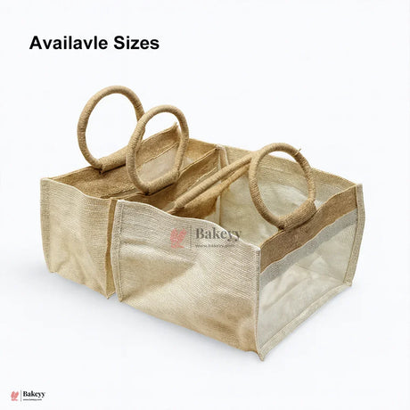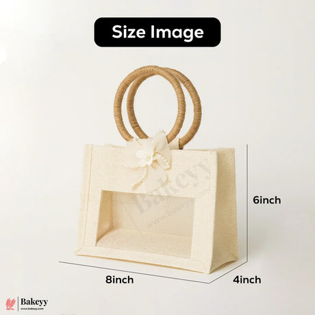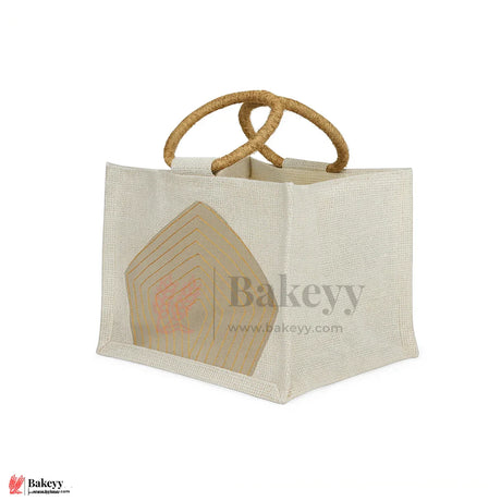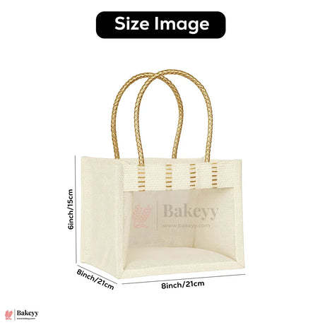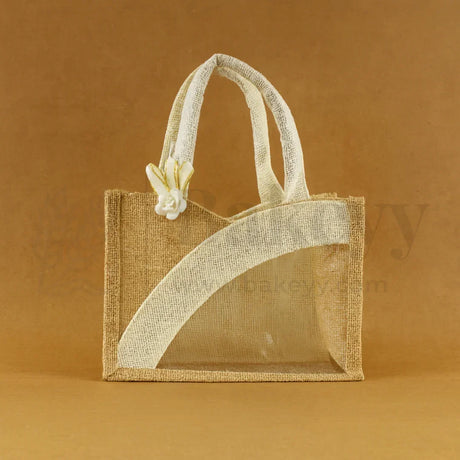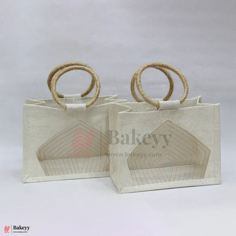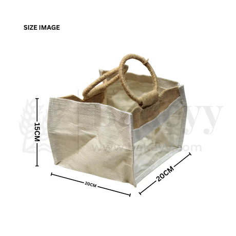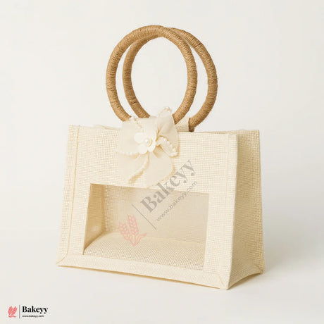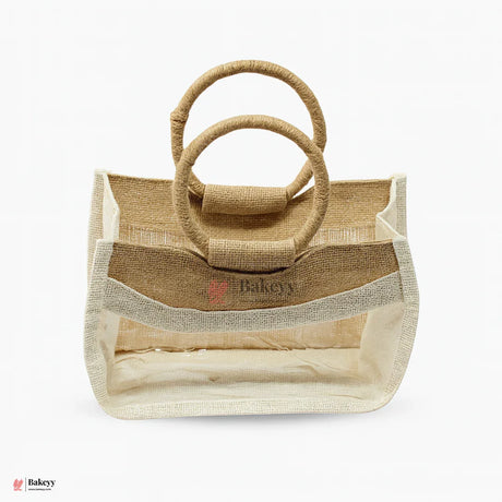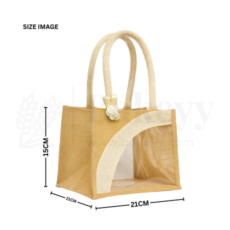 22x21x15 cm Beige & Cream Jute Gift Bag with Transparent Window & Round Handles Pack Of 1