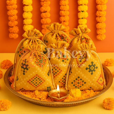 Bandhini Print Potli Bag with Drawstring – Festive Gift Pouch | Yellow | Pack of 10