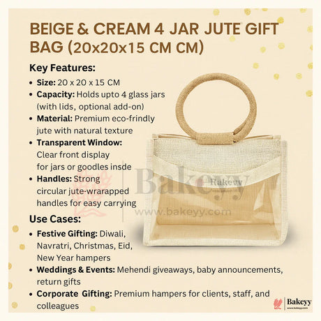 20x20x15 CM | Beige & Cream 4 Jar Jute Gift Bag with Window & Round Handles – 1 Piece