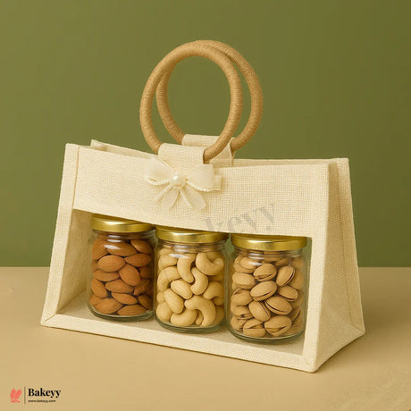 21x21x15 CM | Cream 4 Jar Ethnic Jute Gift Bag with Front Window & Golden Handle – 1 Piece