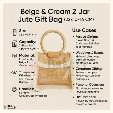 22x10x14 CM | Beige & Cream 2 Jar Jute Gift Bag with Window & Round Handles – 1 Piece