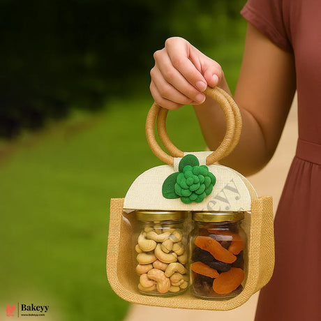 8x6x4 Inch Premium 2 Jar Jute Gift Bag with Transparent Window & Floral Accent – Pack Of 1