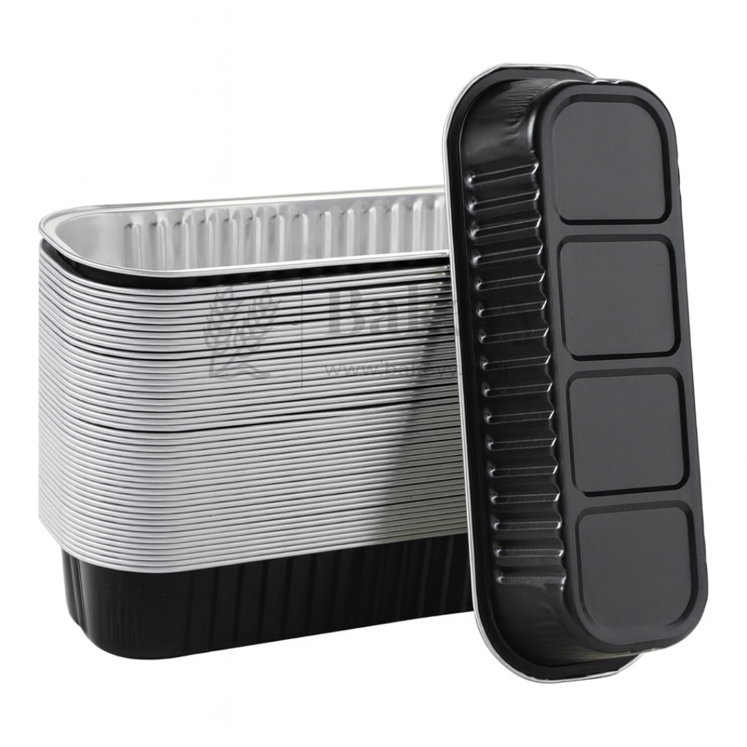 This premium rectangular aluminum food container features a sleek neutral black exterior with a silver inner lining and a transparent dome lid for a clean, modern presentation. Designed for both baking and takeaway use, it maintains an elegant look while offering practicality and durability.
