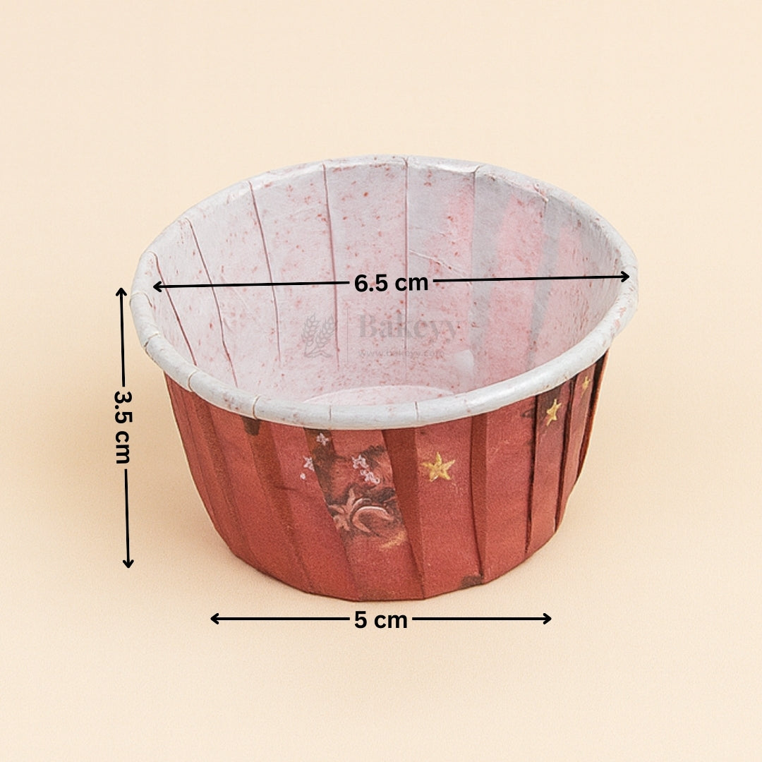 Each cup comes with a top diameter of 6.5 cm, bottom diameter of 5 cm, and a height of 3.5 cm, making them suitable for cupcakes, muffins, and small desserts. The inner lining helps prevent leakage, while the outer surface features simple gingerbread-themed artwork in two colour options—red and green.