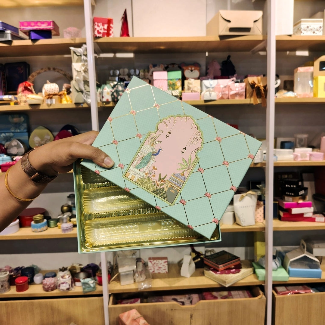 Present sweets and festive treats in a refined and elegant way with this luxury mint green mithai gift box. Designed with a sophisticated quilted diamond pattern accented with delicate gold lines and lotus motifs, the box features a beautiful Mughal-inspired illustration showcasing a graceful peacock, palace pavilion, hanging lanterns, and botanical elements within a decorative arch frame. The soft pastel mint color combined with intricate artwork gives the box a premium festive appearance suitable for luxury gifting.
