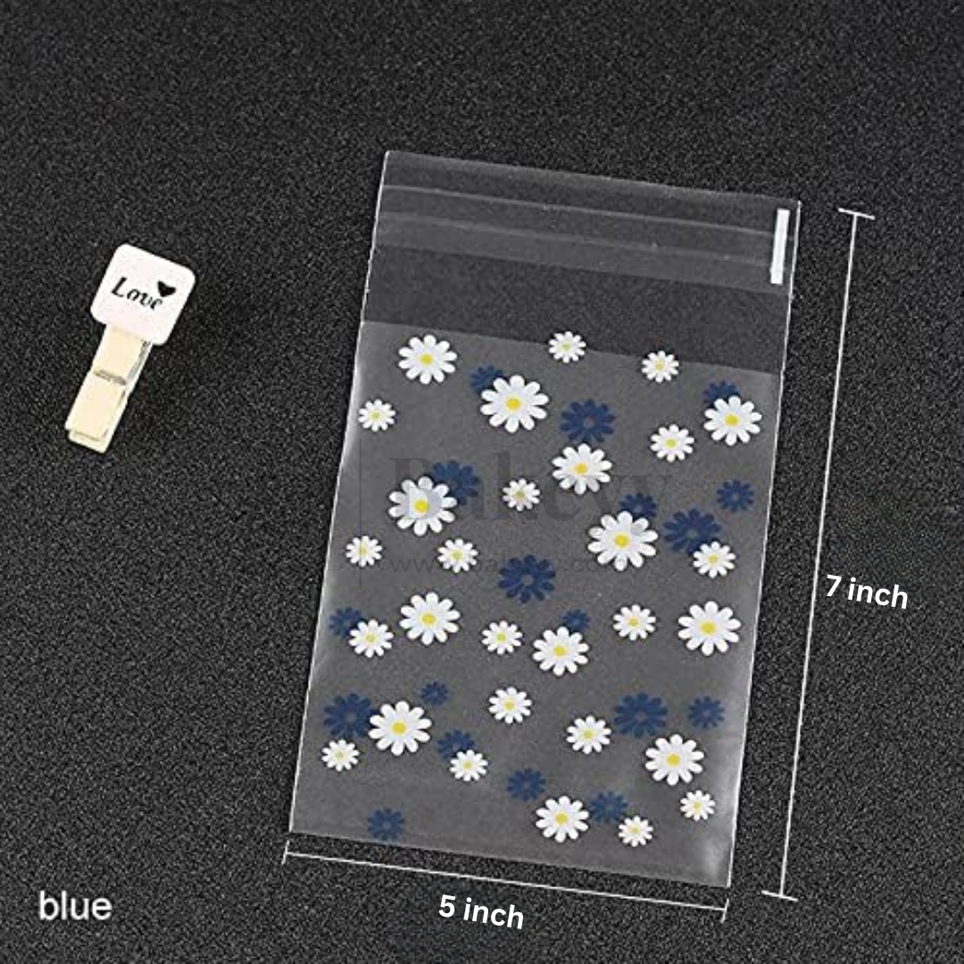 Daisy Flower Cellophane Bags | Blue and White | Clear Plastic Self Sealing Envelope Crystal Bag | Pack of 100