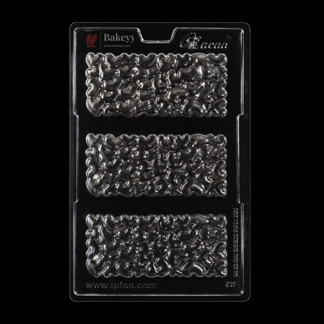 This rectangular chocolate mould features three spacious cavities, each filled with a detailed heart pebble texture that gives chocolates a refined, artisanal finish. Made from transparent food-grade plastic, the mould allows clear visibility during pouring and setting, helping ensure even filling and consistent results.