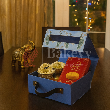 8x8x4 Inch | Royal Blue Peacock Design Hamper Box with Leather Handle | Pack of 1