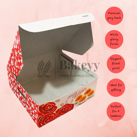 Rs. 600.00Rs. 750.00Unit price /UnavailableLow stock (10 units)9x9x4 cm | 4 Ladoo sweet box | Premium grey back | Rose print | Pack of 100