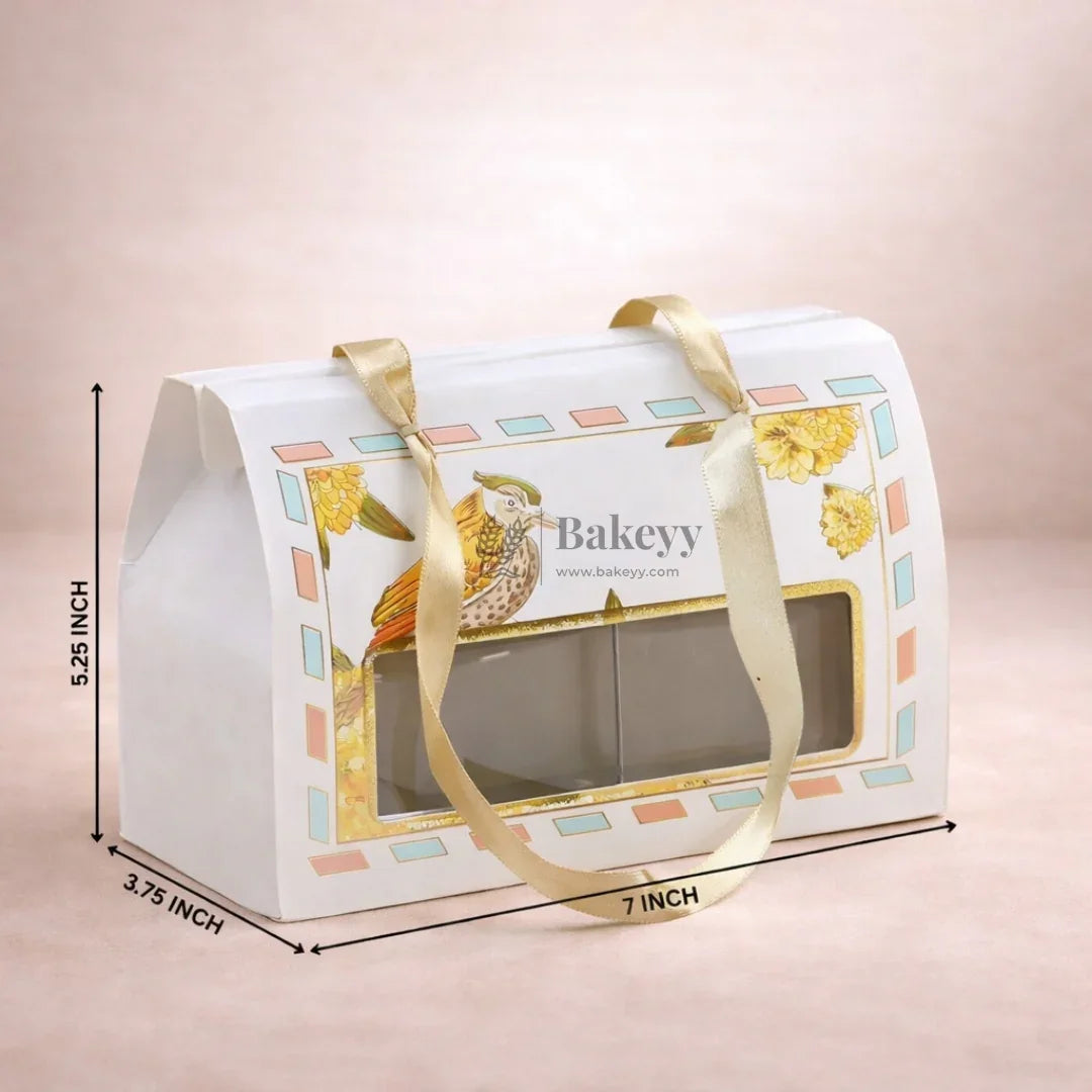 Add a touch of elegance and culture to your gifting with this beautifully crafted Premium Designer Window Box. Featuring an intricate bird print with floral accents, this gift box blends traditional charm with modern functionality. The transparent window lets recipients preview the surprise inside, while the soft golden satin ribbon handles make it easy to carry.