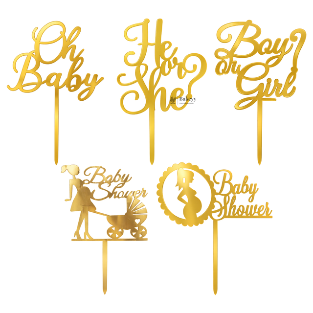 4 Inch Gold Acrylic Baby Shower Cake Topper | Oh Baby, Mom To Be & Baby Shower Designs | Pack of 5