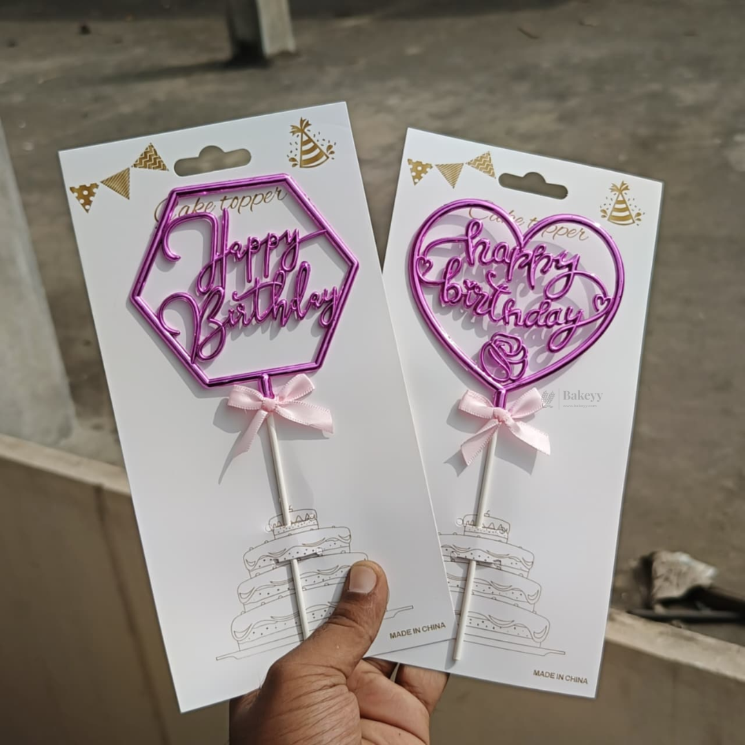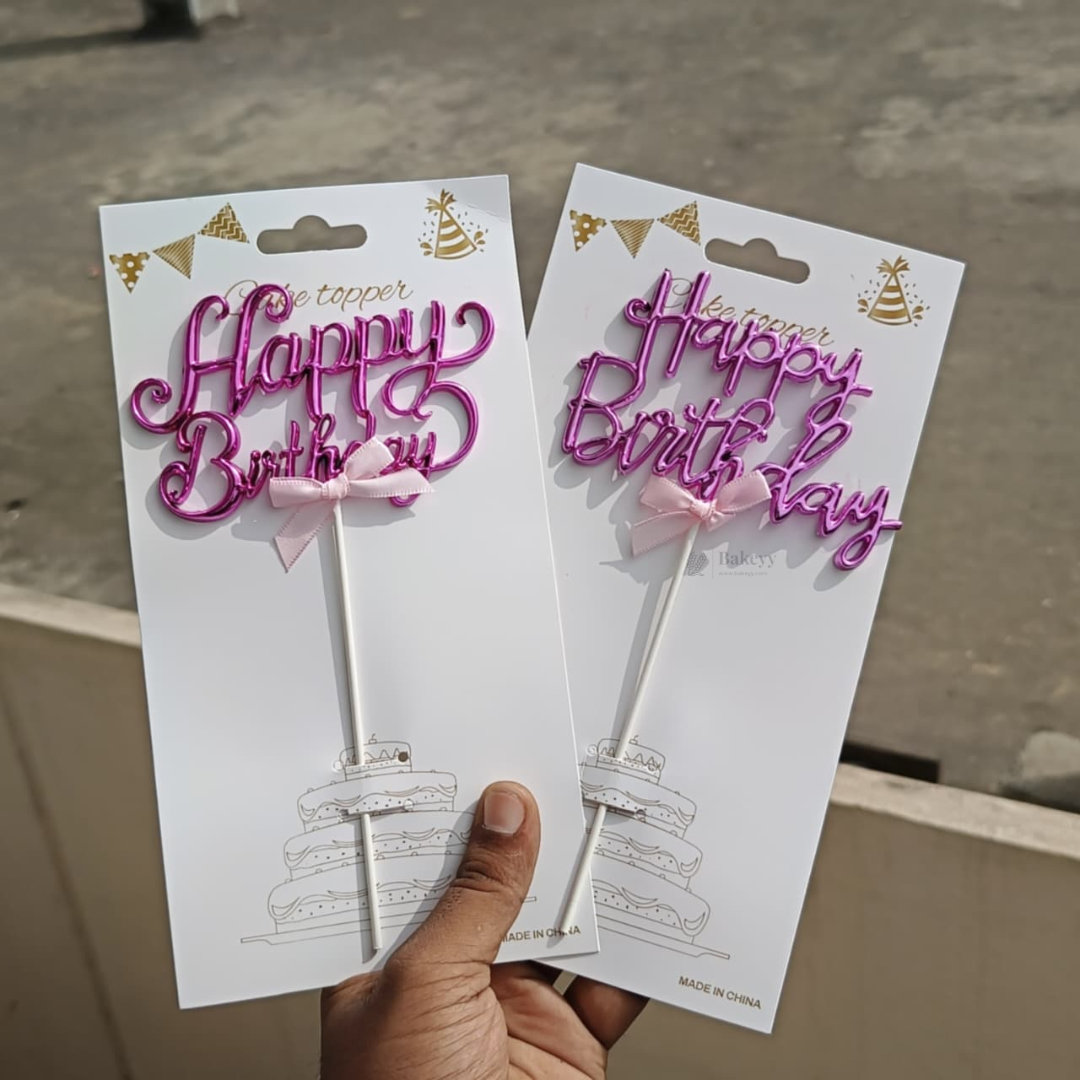 8.5 Inch | Metallic Pink Happy Birthday Cake Topper with Ribbon | Metallic Pink | 1 Piece