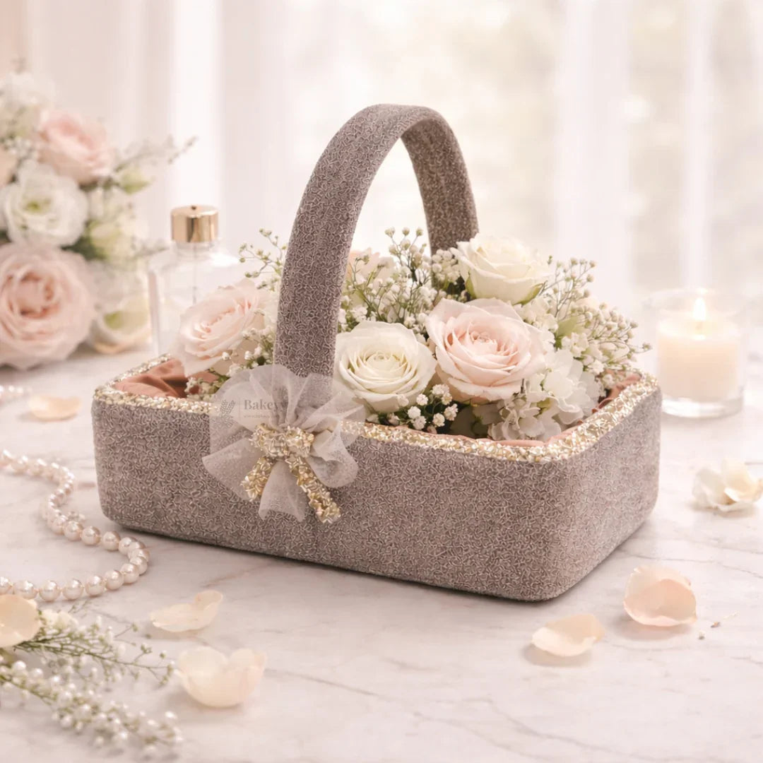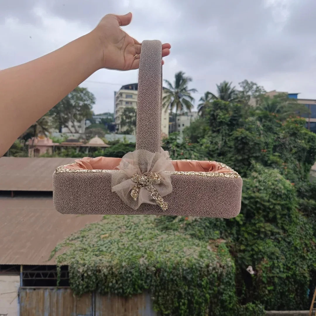 Add a touch of elegance and sophistication to your gifting with this beautifully crafted fabric gift basket. Designed with a premium textured fabric exterior, soft inner lining, and a delicate bow accent, this basket is perfect for creating luxurious gift hampers. The gold-trimmed edges enhance its refined look, while the sturdy padded handle makes it easy to carry and present.