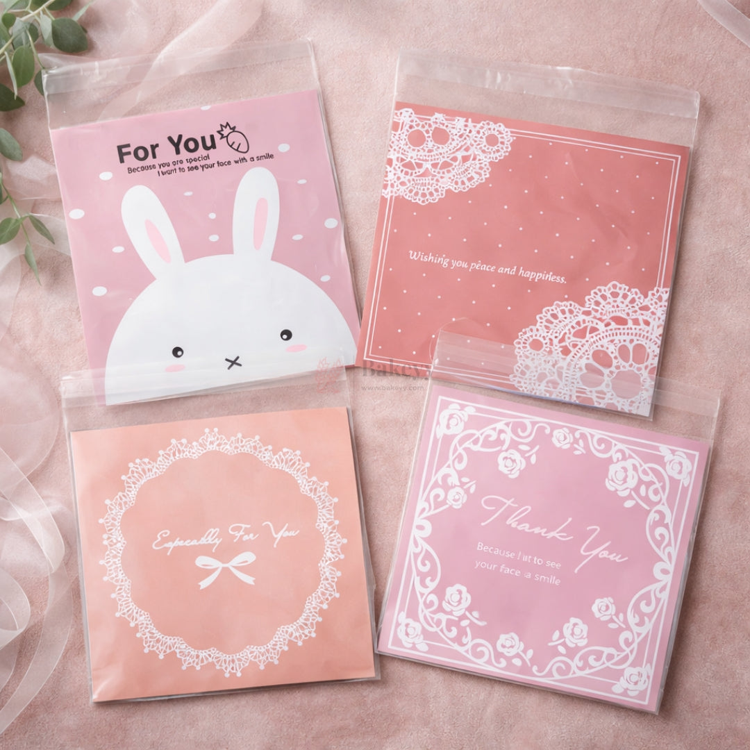 Upgrade your packaging presentation with these premium printed cellophane pouches designed for elegant and professional gifting. Featuring four unique designs including bunny print, lace corner pattern, floral thank you frame, and delicate “Especially For You” artwork, each pouch offers a soft pastel aesthetic with crisp white detailing.