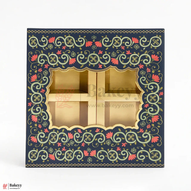 Present your festive treats in style with this luxurious 4-compartment hamper box. Crafted with a sturdy rigid board base in a rich coral hue and finished with a striking navy blue lid adorned in intricate floral and gold motifs, this box exudes elegance and charm. The transparent window lets your recipients admire the contents inside, while the golden inner compartments keep items neatly separated. Ideal for gifting dry fruits, nuts, sweets, chocolates, or other festive goodies during Diwali, weddings, and special occasions.