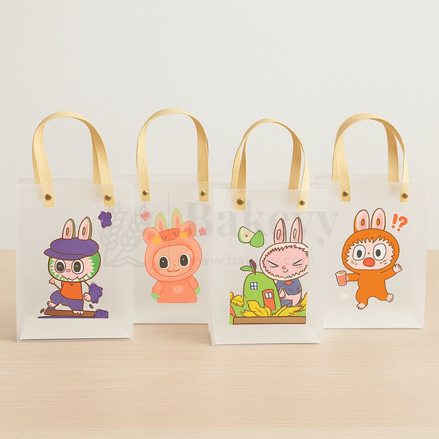 Pack your gifts and goodies in style with these Frosted Plastic Carry Bags with Cartoon Print. Made with a sturdy frosted finish and strong ribbon handles, these bags are both attractive and reusable. The cute cartoon design adds a fun touch, making them perfect for parties, return gifts, hampers, and festive packaging.