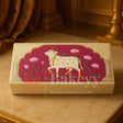 Present your festive delights in this elegant cow print sweet box that beautifully blends tradition with luxury. Crafted with a sturdy board base, the box showcases a stunning Rajasthani-style miniature painting of a white cow adorned with golden accents, set amidst blooming lotus flowers on a vibrant magenta backdrop. The ornate golden floral borders on the lid and sides elevate its regal charm, making it perfect for premium gifting.
