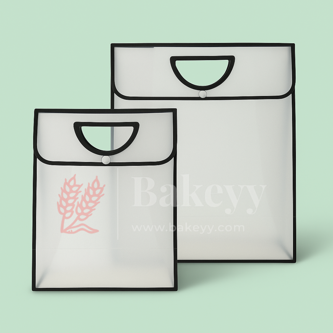 A sleek and minimalistic transparent PVC bag designed for gifting, hampers, and premium product packaging. The bag is crafted from high-quality frosted PVC material with a sturdy black border and a secure button lock closure. Its structured rectangular shape ensures your gifts stand upright and look elegant, while the semi-transparent body adds a touch of luxury and sophistication.