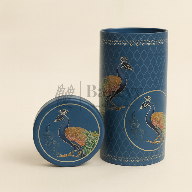 An elegant tall tin container featuring a royal peacock motif with intricate golden detailing. Crafted in a deep blue finish, this premium tin exudes sophistication and is perfect for festive gifting, wedding hampers, or luxury packaging. Its tall cylindrical design makes it ideal for storing dry fruits, chocolates, cookies, tea leaves, coffee beans, or sweets. Durable and reusable, it adds a regal charm to any occasion.