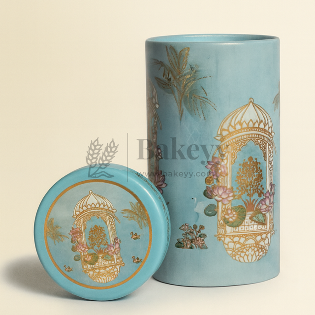 Add a touch of elegance to your storage and gifting with this beautifully designed cylindrical tin container. Measuring 7 cm in diameter and 15 cm in height, it is crafted from premium-quality tin and decorated with intricate golden floral and arch motifs that give it a regal, festive appeal.