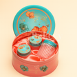 This luxury floral metal tin box in a stunning peach and aqua dual-tone design is the perfect choice for premium gifting. Measuring 7.5 inches in diameter and 4 inches in height, it comes with three acrylic jars (3.5" height × 2.5" diameter each), each finished with matching floral-printed metal lids for a coordinated, elegant look.
