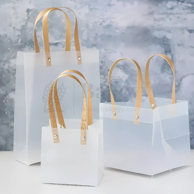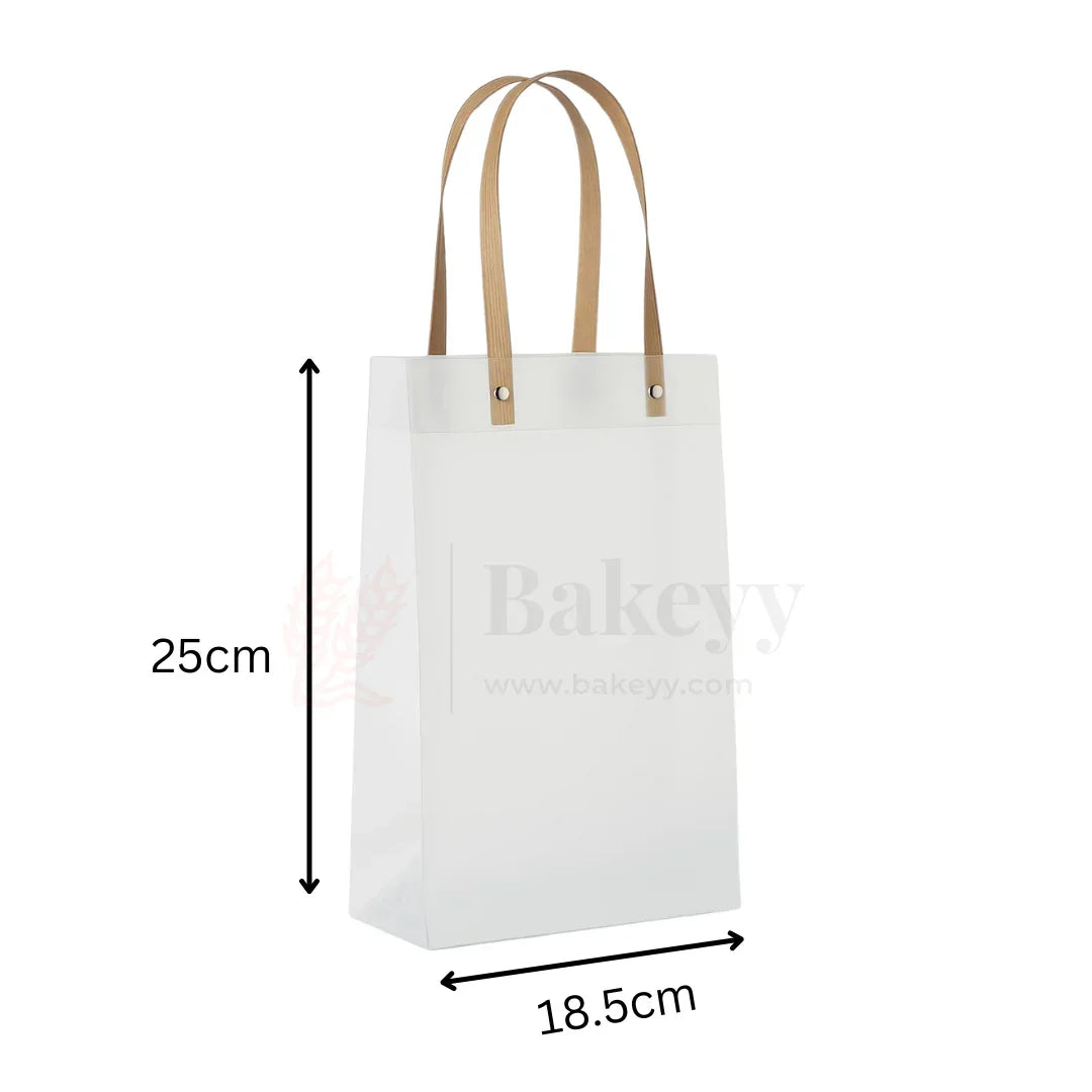 Frosted Matte Gift Bag with Wood-Textured Handles | Translucent PVC Party Favor & Retail Packaging | Pack Of 12