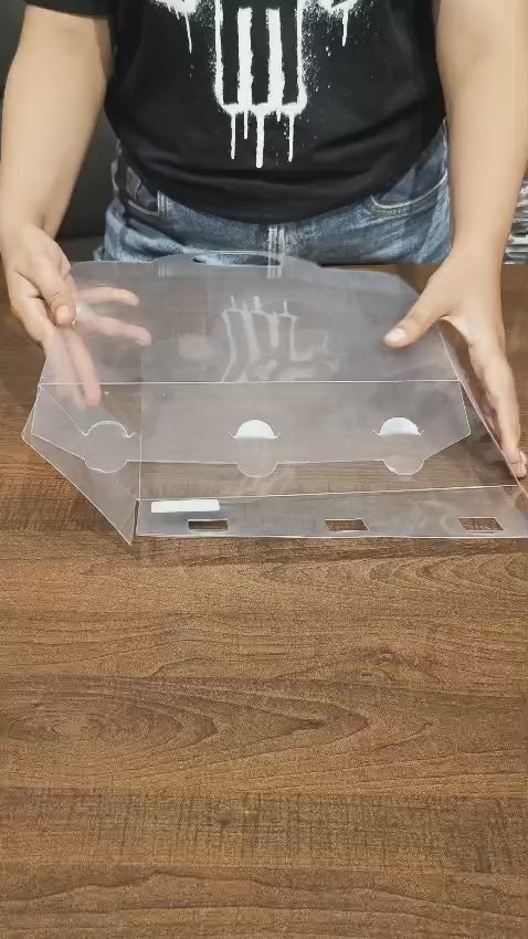 Its sleek transparent finish makes it ideal for packing chocolates, candles, cosmetics, hampers, decor items, or small gift boxes, allowing the contents to shine through beautifully. The built-in handles ensure easy carrying and a refined look for both retail and personal gifting.