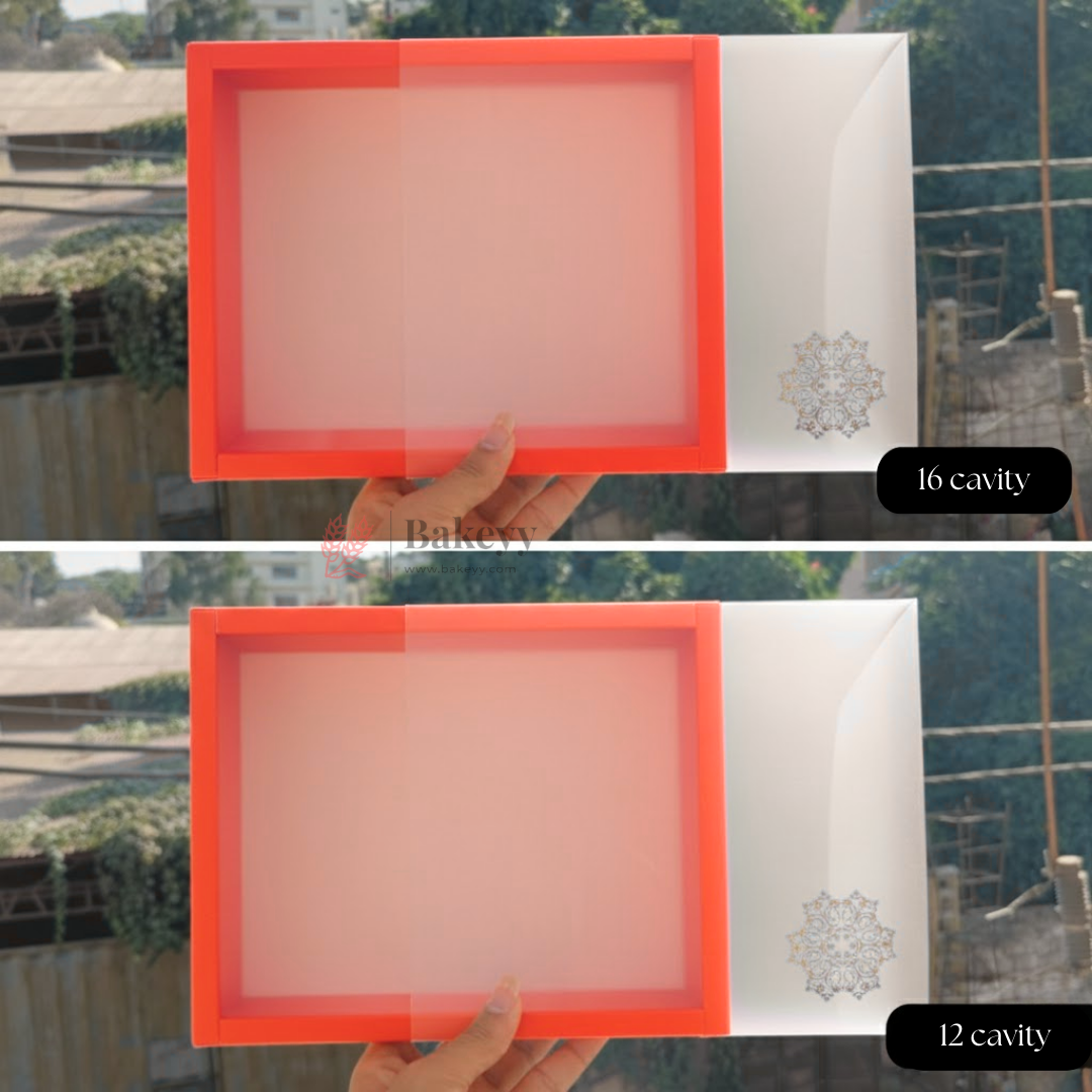 Make your chocolate gifting look premium with this sliding chocolate box in a stylish Red frame with a Red cavity tray.