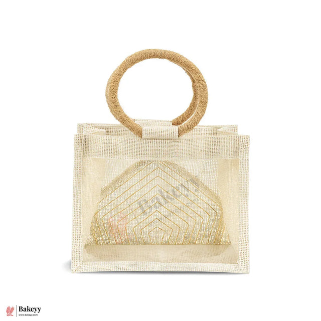 22x10.5x15 cm Beige & Cream Jute Gift Bag with Transparent Window & Round Handles Pack Of 1