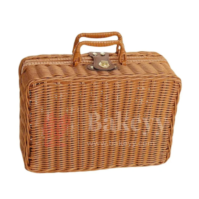 With its natural woven texture and suitcase-style look, this basket adds a rustic charm while being functional and long-lasting. Perfect for organizing essentials, carrying baked goods, or presenting festive hampers.