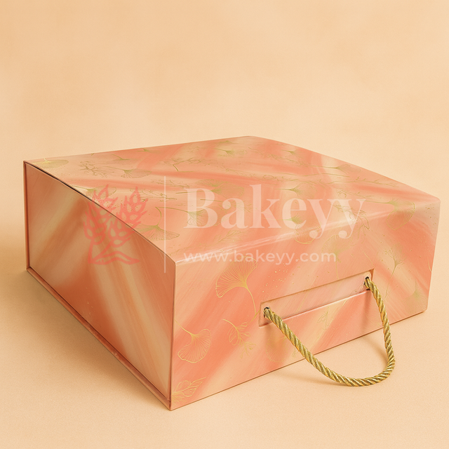 This premium gift box comes in an elegant peach floral print with golden detailing, paired with a sturdy rope handle for easy carrying. Measuring 10 x 10 x 4 inches, it provides ample space for hampers, sweets, or festive gifting. The collapsible design allows the box to be laid flat when not in use, making it convenient for storage and bulk handling. Crafted with rigid board and adhesive-bonded corners, the box ensures durability along with a luxurious look.