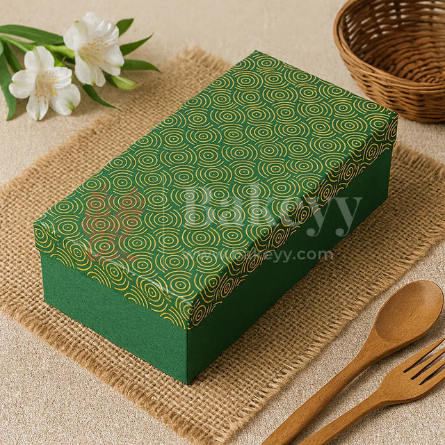 Present your gifts in style with this elegant rectangular hamper box. Crafted from premium rigid board, the box features a rich green base paired with a striking lid adorned in intricate golden circular motifs. The luxurious design and sturdy structure make it perfect for presenting festive treats or thoughtful gifts.