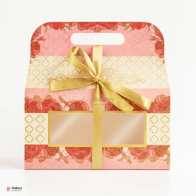 Present your gifts in style with this elegant floral printed gift box, featuring intricate rose patterns, a golden satin ribbon bow, and a transparent window for a sophisticated display. Perfect for weddings, birthdays, festive hampers, bakery treats, and return gifts, this box blends beauty with practicality.
