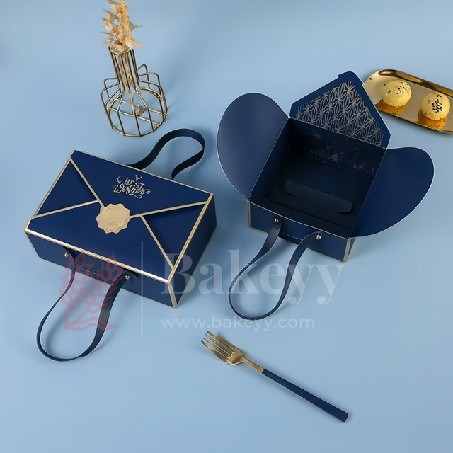 Bring sophistication to your gifting with this luxury navy blue foldable gift box, finished with elegant golden detailing and a premium envelope-style closure. Made from high-quality board, the deep navy matte finish contrasts beautifully with metallic gold borders and embossed seal detailing. The wide-opening flap reveals a spacious interior lined with intricate golden foil patterns, making it perfect for sweets, chocolates, dry fruits, or festive hampers.